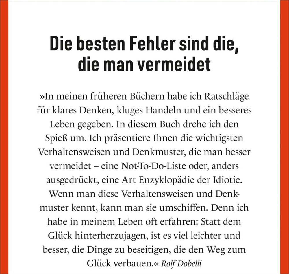 »In meinen früheren Büchern habe ich Ratschläge für klares Denken, kluges Handeln und ein besseres Leben gegeben. In diesem Buch drehe ich den Spieß um. Ich präsentiere Ihnen die wichtigsten Verhaltensweisen und Denkmuster, die man besser vermeidet – eine Not-To-Do-Liste oder, anders ausgedrückt, eine Art Enzyklopädie der Idiotie. Wenn man diese Verhaltensweisen und Denkmuster kennt, kann man sie umschiffen. Denn ich habe in meinem Leben oft erfahren: Statt dem Glück hinterherzujagen, ist es viel leichter und besser, die Dinge zu beseitigen, die den Weg zum Glück verbauen.« Rolf Dobelli