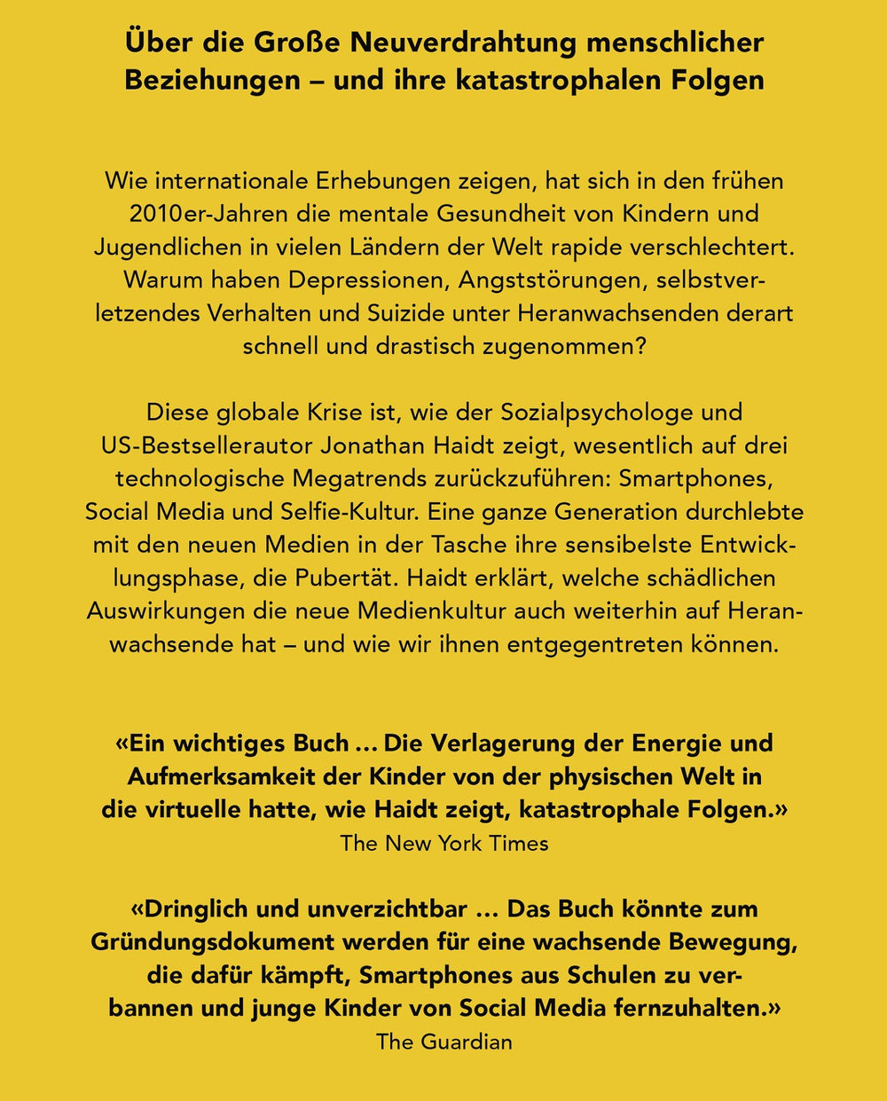 Ein wichtiges Buch … Die Verlagerung der Energie und Aufmerksamkeit der Kinder von der physischen Welt in die virtuelle hatte, wie Haidt zeigt, katastrophale Folgen. The New York Times, 27. März 2024