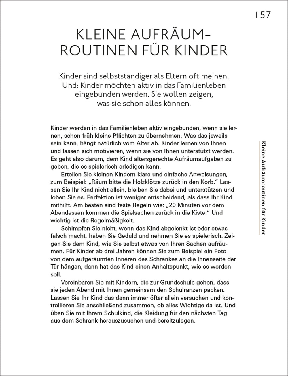 Der erste Teil des Buchs zeigt Ihnen, wie Sie das Unnötige loslassen; der zweite Teil hilft Ihnen, Motivationsbarrieren zu überwinden und Ihren eigenen Stil zu entwickeln. Im dritten Teil finden Sie praktische Routinen, die sich mühelos in jeden Alltag integrieren lassen, um langfristig von einem geordneten Lebensstil zu profitieren.