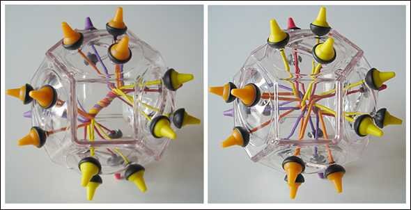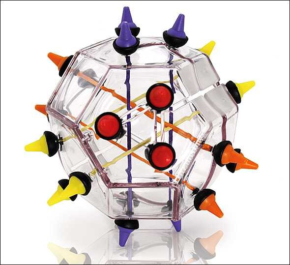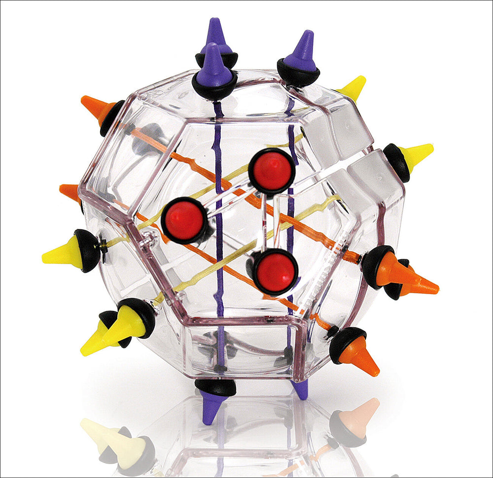 Der 3D-Knoten-Ball ist ein geniales Puzzle aus den Niederlanden, das selbst erfahrene Denksportler nicht unterschätzen sollten. In Form eines transparenten, abgestumpften Oktaeders verbirgt sich ein komplexes Netz aus 12 elastischen Schnüren in vier verschiedenen Farben. Diese Schnüre sind so gespannt, dass sie im Grundzustand ein perfektes symmetrisches Gitter bilden, in dem sich die Bänder nicht berühren.