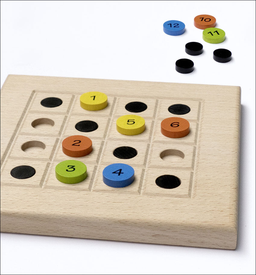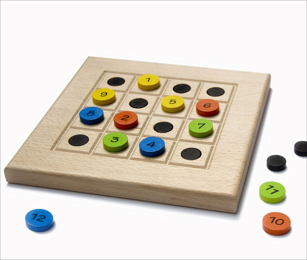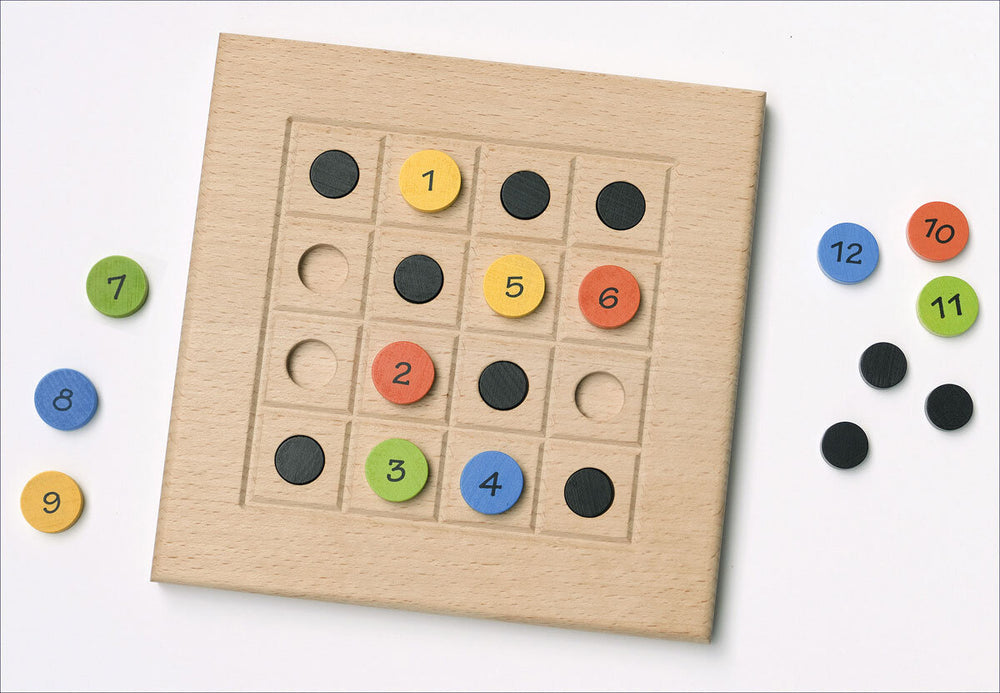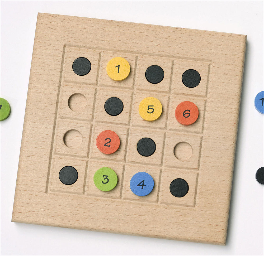 Denkspiel für 1 Spieler ab 10 Jahren. Spielbrett, 17.5 x 17,5 cm, Buche massiv geölt, 22 Spielsteine, Aufgaben- und Lösungsheft, Baumwollbeutel.