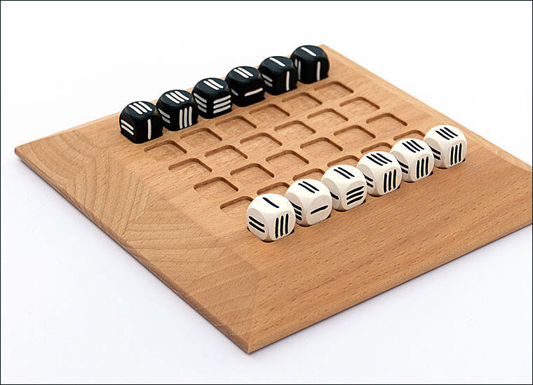 Taktikspiel von Klaus Nehren für 2 Personen. Ab 8 Jahre. Spielbrett aus massiver Buche, geölt, 20 x 20 cm. Je 6 Sonderwürfel in schwarz und weiß.
