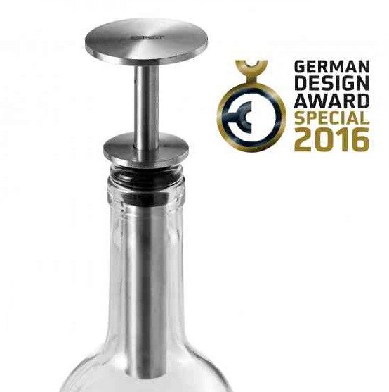 „Das Leben ist zu kurz für schlechten Wein, sagte schon Johann Wolfgang von Goethe. Umso wichtiger ist es, edle Tropfen, die nicht ausgetrunken wurden, wieder gut zu verschließen. Mit der Wein-Vakuumpumpe CHAMP lässt sich der Sauerstoff in der Flasche leicht entziehen, wodurch der Oxidationsprozess des Weins gestoppt wird und das Aroma erhalten bleibt. CHAMP verbleibt wie ein Korken auf der Flasche. Sein flaches Design ermöglicht es, die Flasche im Kühlschrank aufzubewahren. Ein funktionales Produkt, das durch die reduzierte Formensprache und die Verwendung von Edelstahl sehr hochwertig wirkt."