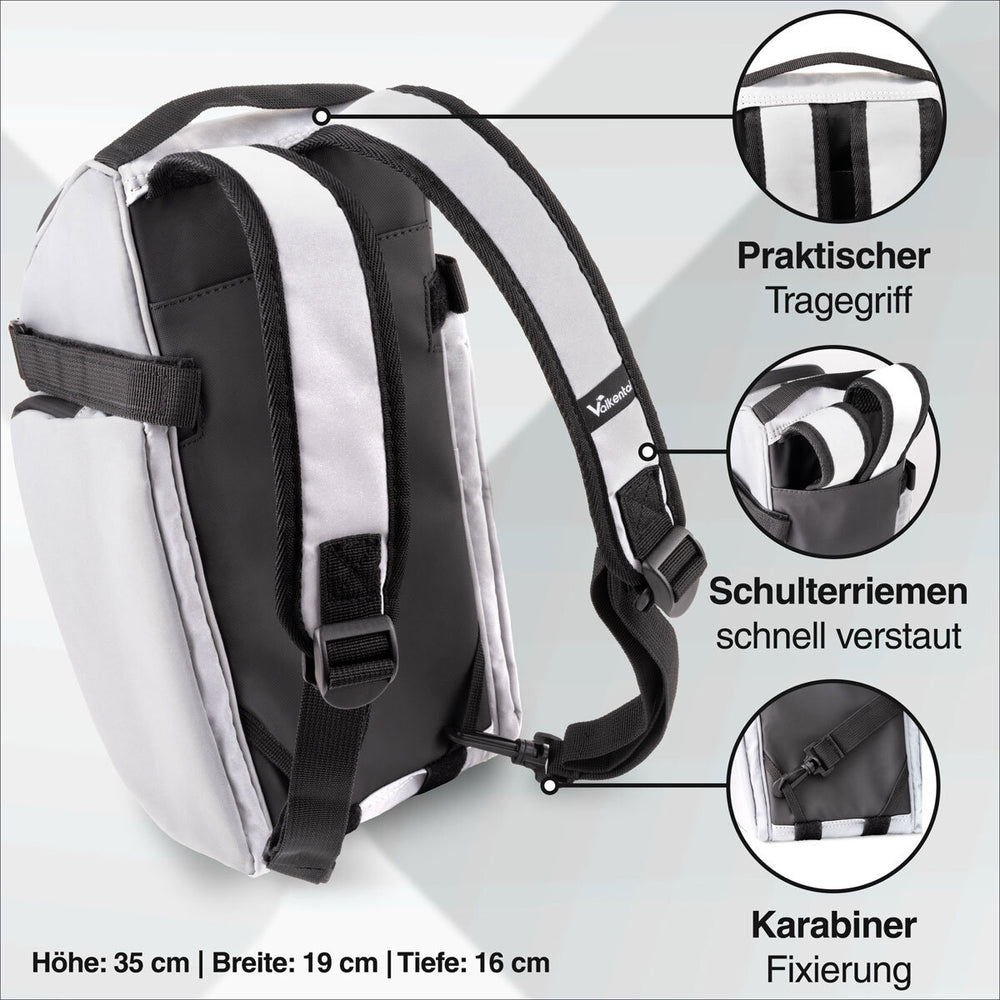 Ein echtes Highlight: Der schnelle Wechsel zwischen Rucksack und Umhängetasche. Kein lästiges Umpacken mehr – einfach die Trunk Bag umfunktionieren und los geht’s. Für Ihre Sicherheit sorgt das wasserfeste, reflektierende Material, das Sie auch bei schlechten Lichtverhältnissen gut sichtbar macht.