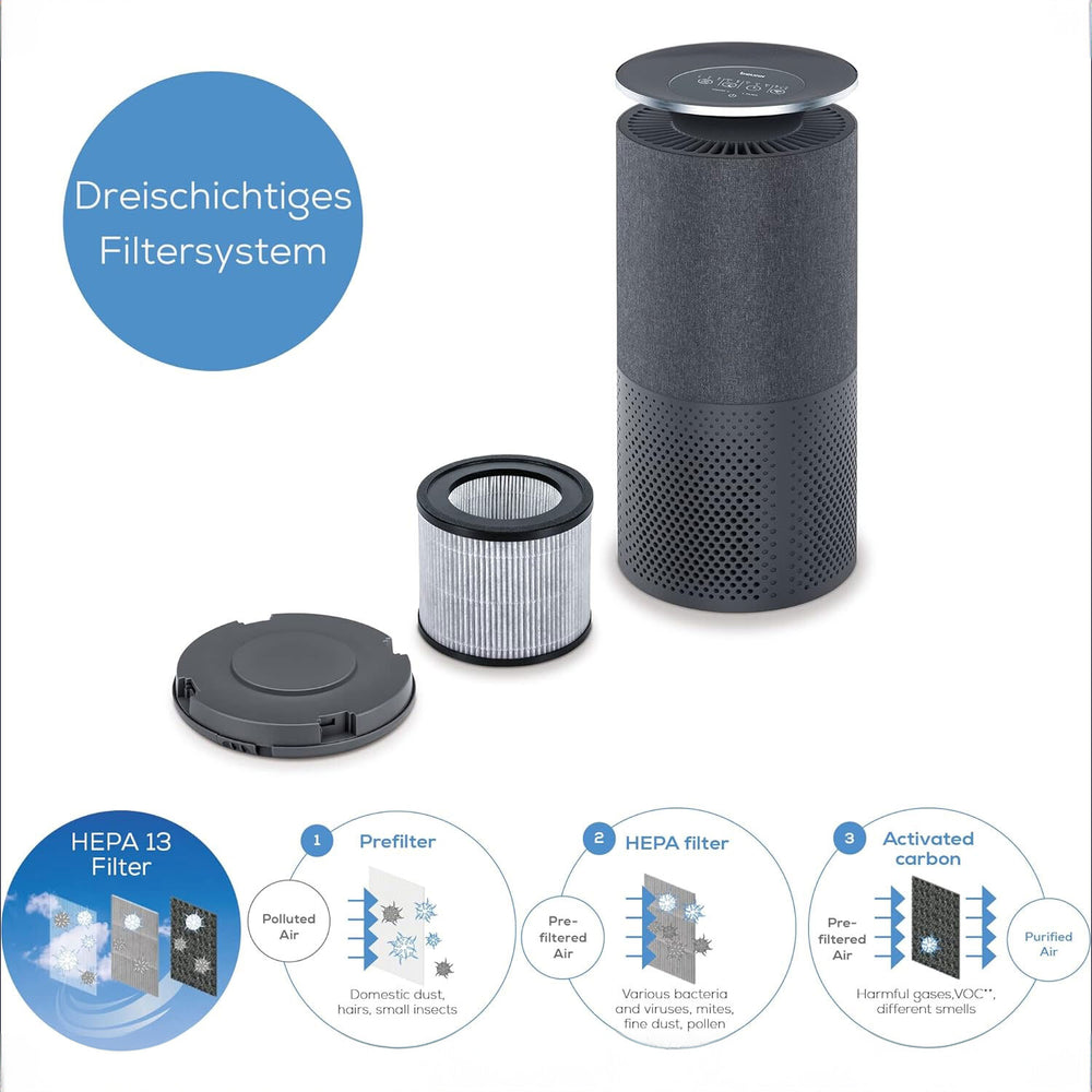 • Wechselbarer, nachbestellbarer HEPA13 Filter (Laufzeit: ca. 4320 Stunden) mit Filterwechselanzeige