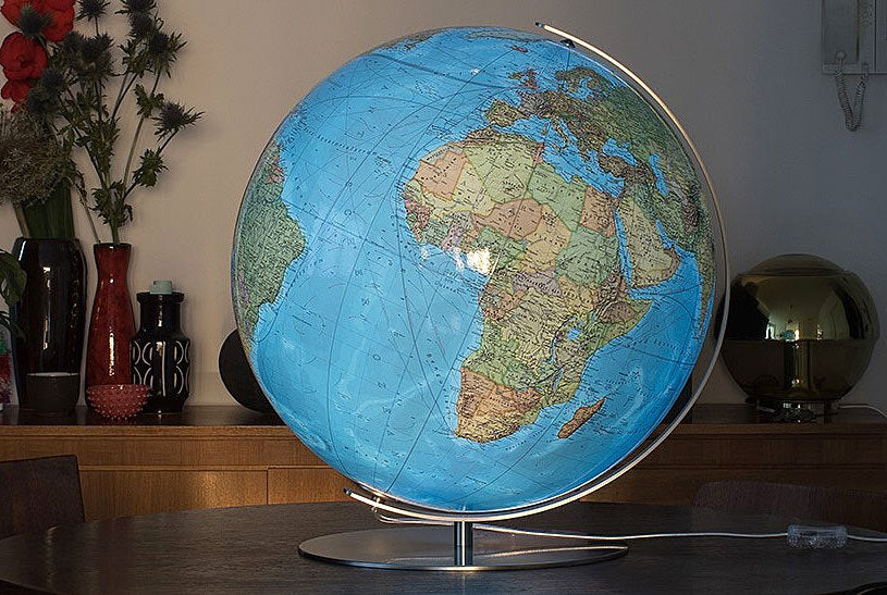 Beleuchteter Globus mit Acrylglaskugel Ø 34 cm, handkaschiert, OID-kompatibel. Eintragungen ca.: 4400. Maßstab: 1:38.000.000. Kartenbild physisch und politisch.