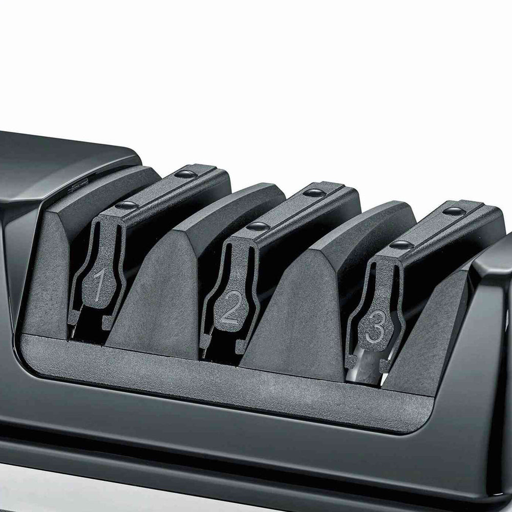 Der einzigartige 3-Phasen-Schliff macht das Schärfen Ihrer Messer zum Kinderspiel. In der Vorschärf- und Schärfphase sorgen Diamantscheiben für minimalsten Materialabtrag, während die langsamen Schleifscheiben den Messerstahl schonen und ein Ausglühen der Klinge verhindern. Die abschließende Polierphase mit Keramikscheiben verwandelt Ihre Klinge in ein rasiermesserscharfes Werkzeug.