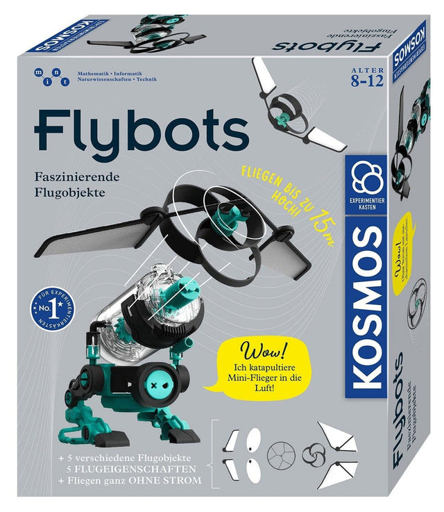 Der KOSMOS-Experimentierkasten Flybots verbindet Spielspaß mit naturwissenschaftlichem Lernen. Kinder bauen fünf unterschiedliche Flugobjekte zusammen, die sich in der Luft jeweils verschieden verhalten – sie gleiten, flattern oder fliegen Kurven.