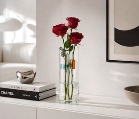 Durchgefärbtes Borosilikatglas sorgt für hohe Materialstabilität und eine klare Farbtiefe, während die dezent gesetzten Glasringe eine rhythmische Struktur in der vertikalen Silhouette erzeugen. Einzelne langstilige Blumen oder Zweige lassen sich gezielt inszenieren oder zu kleineren Kompositionen bündeln. Dadurch entsteht ein Blickfang, der zwischen Designobjekt und funktionaler Steckvase vermittelt. Ob Frühling, Ostern, Sommer, Herbst oder Weihnachten - die Vase lässt sich flexibel an den Jahresverlauf sowie besondere Anlässe anpassen.
