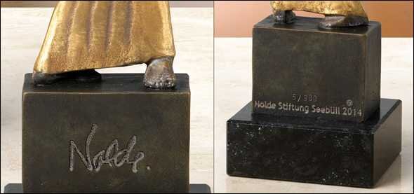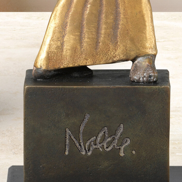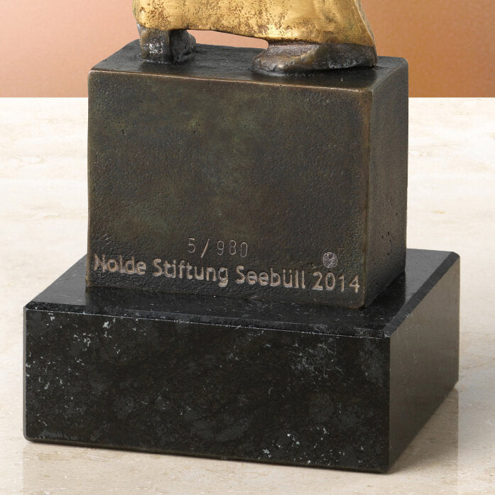 Das Ergebnis ist ein Kleinod der Bildhauerei des 20. Jahrhunderts. Es wird deutlich, dass der Maler Nolde auch gelernter Holzschnitzer war. Jetzt hat die Nolde Stiftung Seebüll erstmals Abgüsse dieser Figur genehmigt: direkt vom Original abgenommen und in Originalgröße reproduziert. Feine Bronze, gegossen von Hand im Wachsausschmelzverfahren. 24 Karat teilvergoldet und weltweit auf 980 Exemplare limitiert.