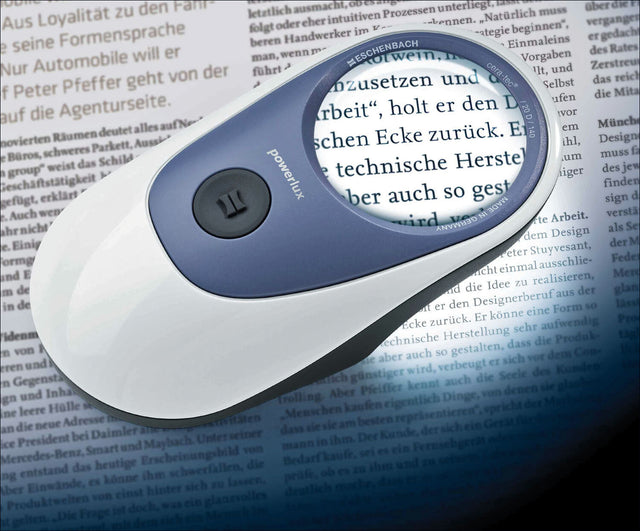 Die Powerlux ergonomische Leuchtlupe von Eschenbach setzt neue Maßstäbe in Sachen Ergonomie und Seherlebnis. Inspiriert von der bewährten Form einer Computermaus, liegt sie angenehm in der Hand und ermöglicht entspanntes Lesen selbst über längere Zeiträume.