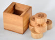 Solo-Denkspiel aus Holz. 6 geprägte Holzchips D 4 cm, Kantenlänge Würfel 7 x 7 cm.