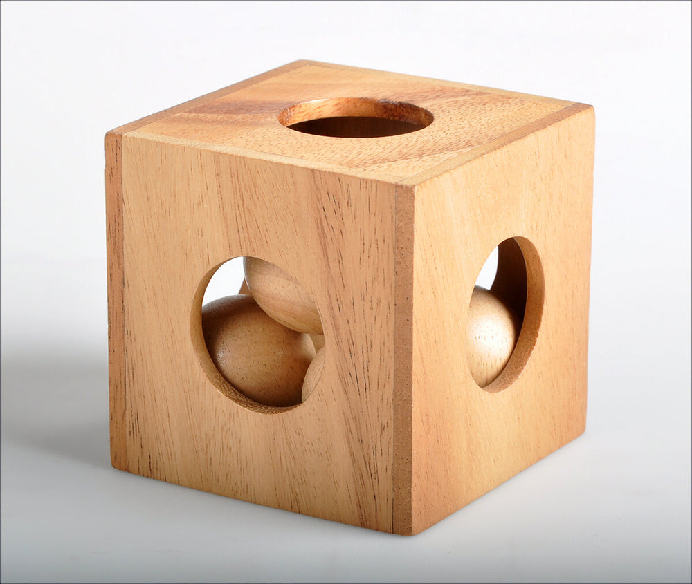 Solo-Denkspiel aus Holz. 6 Kugeln, Kantenlänge Würfel 8 cm.