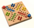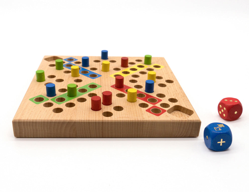 Das massive, geölte Buchenholzbrett wird in einer deutschen Manufaktur gefertigt und kombiniert zeitloses Design mit hoher Funktionalität. Der Deckel dient gleichzeitig als Würfelschale, und die farbigen Stecksteine sitzen sicher im Brett – ideal für Auto- und Bahnfahrten.