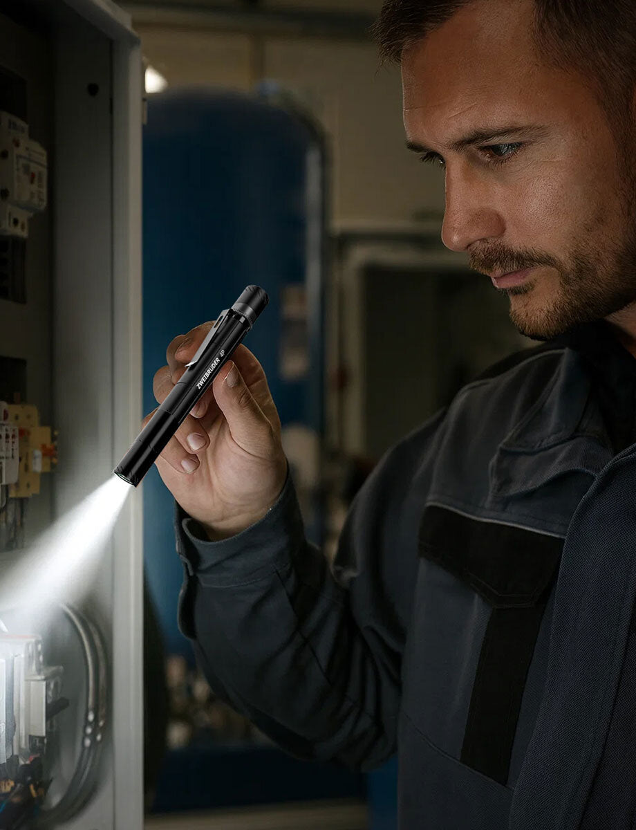 Die Zweibrüder ZB4P vereint anspruchsvolles Lichtdesign mit Dualpower und smarter Energiearchitektur. Ihre schlanke Form mit einer Länge von 14,3 cm und einem Gewicht von nur 60g macht sie zur idealen Stiftlampe für alle, die präzise Ausleuchtung, hohe Flexibilität und zuverlässige Energieversorgung benötigen – ob beim technischen Audit, in Laborumgebungen, in der Medizin oder im täglichen Einsatz in Werkstatt und Industrie.