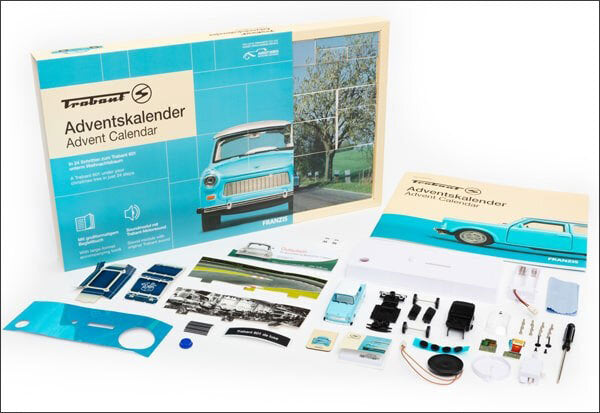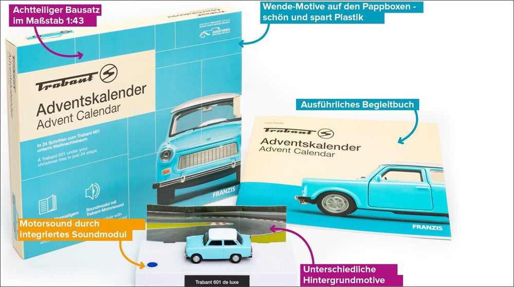 Der Kalender enthält 24 kunstvoll gestaltete Boxen, die beim Zusammenbauen ein beeindruckendes Bild des Trabant 601 ergeben. Und als besonderes Highlight sorgt der originalgetreue Motorsound auf Knopfdruck für nostalgische Momente und lässt den charakteristischen Zweitaktklang wieder lebendig werden.