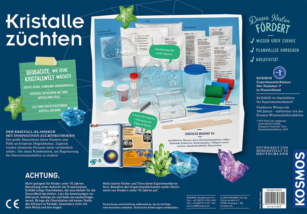 Ganz einfach können kleine Forscher ihre eigene funkelnde Welt erschaffen: Schillernde Einzelkristalle entstehen über Nacht, glitzernde Kristallhöhlen werden selbst hergestellt, Gipsfiguren können mit einer zauberhaften, kristallinen Hülle überzogen werden und als Highlight funkeln nachtleuchtende Kristalle in der kleinen Schatztruhe. Und die selbst gefertigten Drusen sehen ihren Originalen aus der Natur zum Verwechseln ähnlich. Das Wachstum der Kristalle wird selbst Erwachsene erstaunen.
