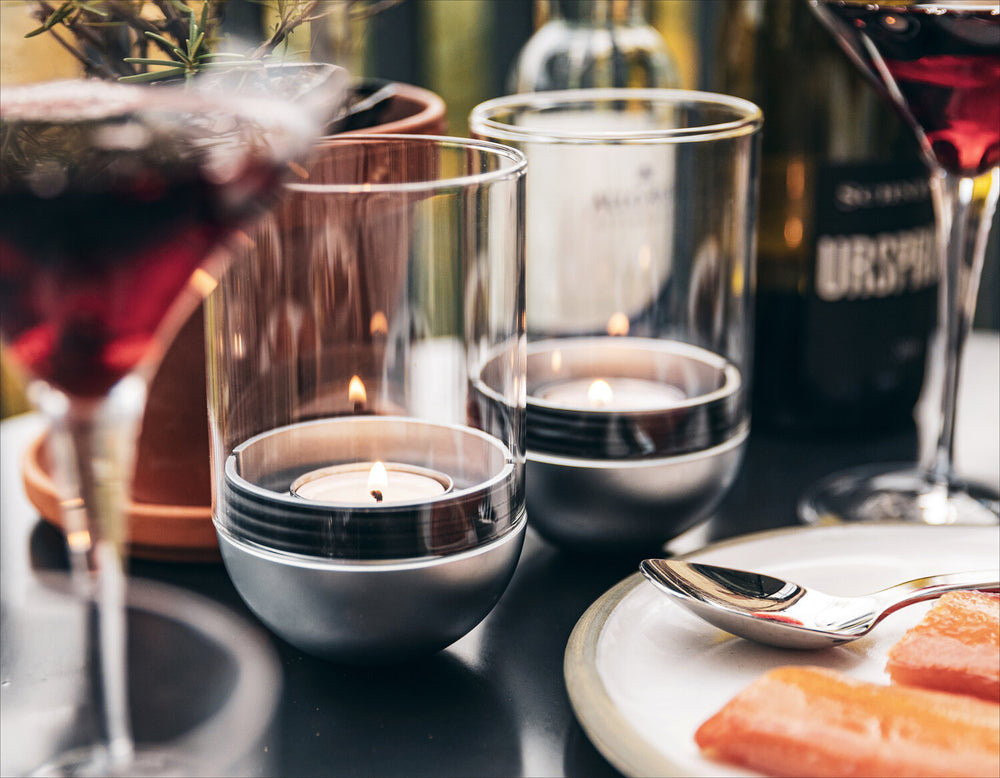 Gravity Candle. Edelstahl und stabiles Glas.