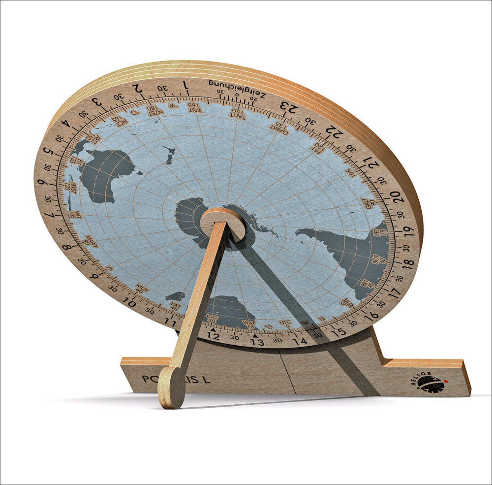 Daten: 22 Bauteile. Durchmesser: 10 cm. Äquatoriale Sonnenuhr mit flächentreuen Weltkarten der nördlichen und südlichen Hemisphäre. Standort geeignet: 64°S bis 64°N. Drehbarer Zeitring mit Zeitgleichungsskala.