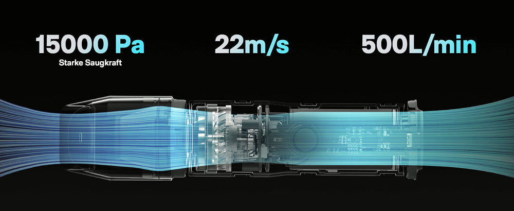 15.000 Pa. Maße: 55 × 56 × 164 mm. Gewicht: ca. 356 g (Netto). Zubehör: Staubbehälter. Beweglicher Bürstensaugkopf. Luftpumpenadapter. Kurz- und Lang-Luftventil. Schwimmringventil. USB-C Ladekabel