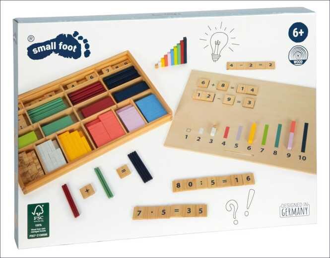 Die enthaltenen Zahlenplättchen und farbigen Rechenstäbe unterstützen das visuelle Erfassen mathematischer Zusammenhänge. Kinder lernen durch Sortieren, Zählen und Vergleichen den sicheren Umgang mit Zahlen, Größen und einfachen Rechenoperationen. Der maßstabsgetreue Druck auf dem Holz-Deckel der Box dient als Spielfläche und zur Selbstkontrolle.
