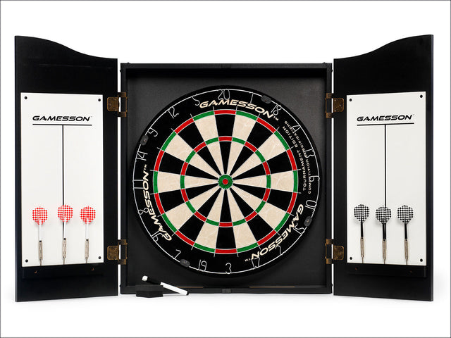Die Scheibe hat die offiziellen Maße von 45,7 cm und wird durch ein stilvolles Kabinett ergänzt. Die schlichten schwarze Holztüren mit hochwertigen Scharnieren sorgen nicht nur für einen edlen Look, sondern bieten im Inneren auch 2 abwischbare Scoreboards zum Mitschreiben.