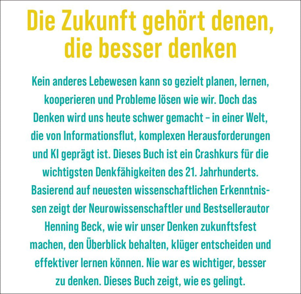Dieses Buch ist ein Crashkurs für die Denkfähigkeiten des 21. Jahrhunderts. Basierend auf neuesten wissenschaftlichen Erkenntnissen zeigt der Neurowissenschaftler Dr. Henning Beck, wie wir den Überblick behalten, klüger entscheiden und effektiver lernen können. Mit vielen praktischen Strategien für Anfänger und Profis – von der Informationsbewältigung bis hin zur »Champions League des Denkens«.
