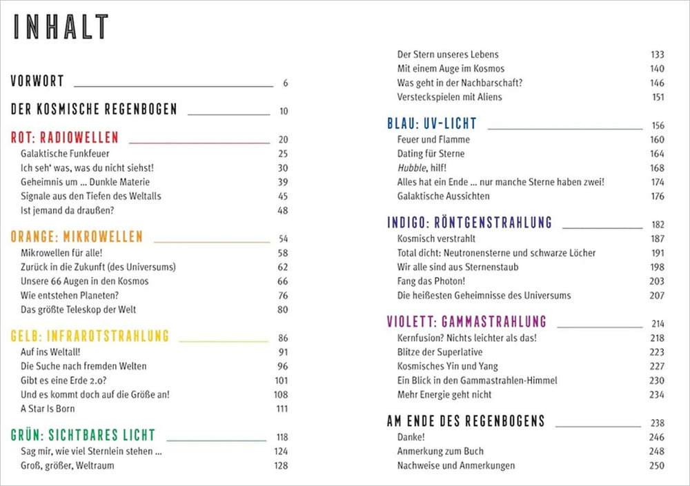 In ihrem Buch stellt Randall die spannendsten kosmischen Phänomene vor, indem sie die Farbpalette des Regenbogens als Leitfaden nutzt. Von den roten Radiowellen bis hin zur violetten Gammastrahlung bringt sie Ihnen die Wunder des Universums näher. Doch das ist nicht alles – sie erklärt auch, wie alltägliche Technologien wie Mikrowellen oder Röntgengeräte funktionieren und was diese mit weit entfernten Galaxien, schwarzen Löchern und Sternembryos zu tun haben.