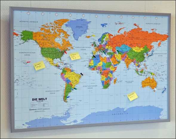 Fantastisch gestaltete Pinnwand mit Weltkarte