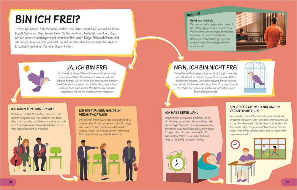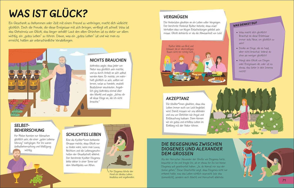 Bekannte Philosoph*innen wie Platon, Simone de Beauvoir oder Machiavelli werden kindgerecht vorgestellt. Mit klaren Grafiken und kurzen Texten gelingt der Einstieg in komplexe Ideen ganz spielerisch. Zahlreiche Beispiele aus dem Alltag helfen, die Gedanken großer Denker*innen auf das eigene Leben zu übertragen.