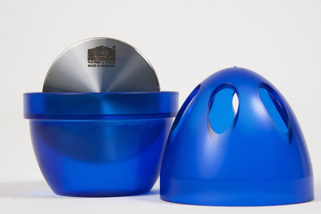 Farbe Blau. Transparenter Kunststoff. Größe: Ø 6,2 Höhe 8,5cm. Scheibe aus Edelstahllegierung. Spülmaschinenfest.