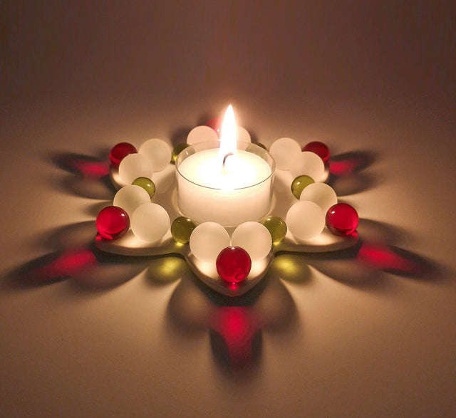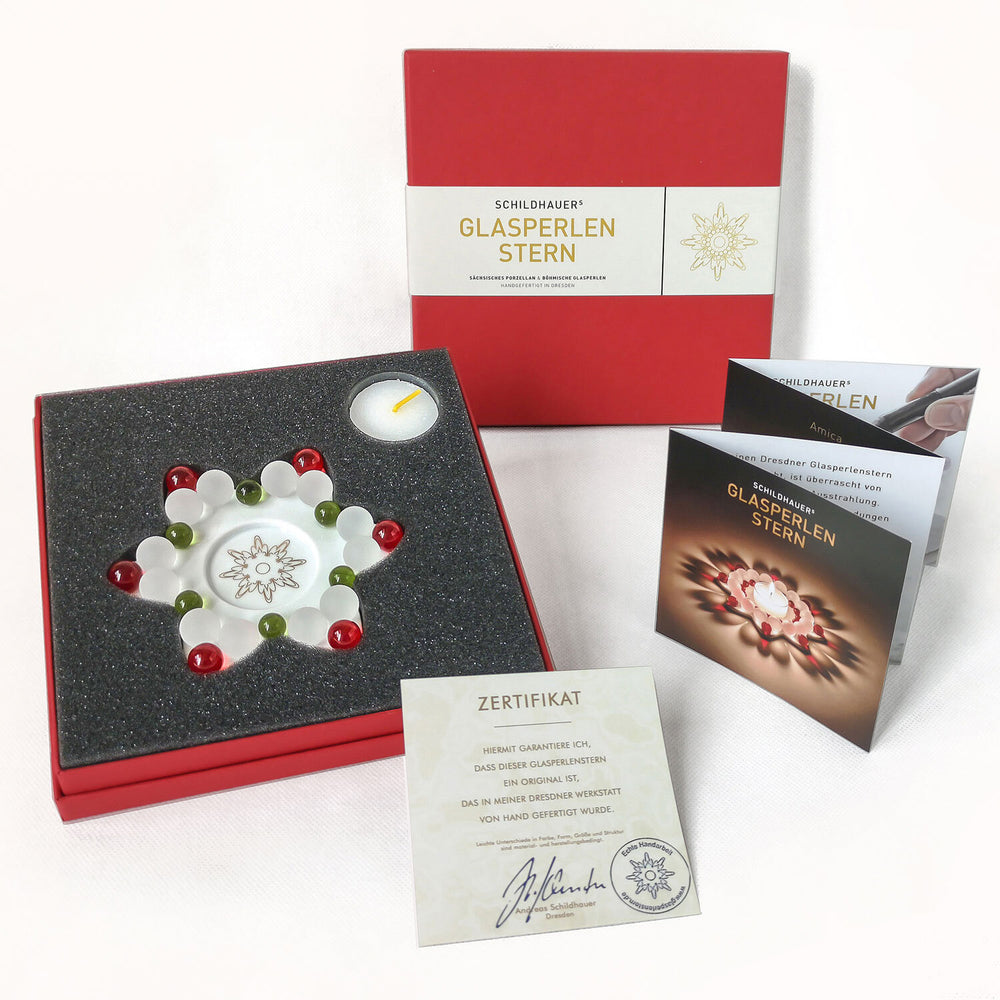 Feinste Lichtobjekte aus Glas und Porzellan: Wer das erste Mal einen Glasperlenstern leuchten sieht, wird überrascht sein von der Ausstrahlung seines intensiven Lichtbildes. Bei Studien zur Lichtbrechung hatte der Dresdner Künstler Andreas Schildhauer die Idee zu den „Dresdner Glasperlensternen“.