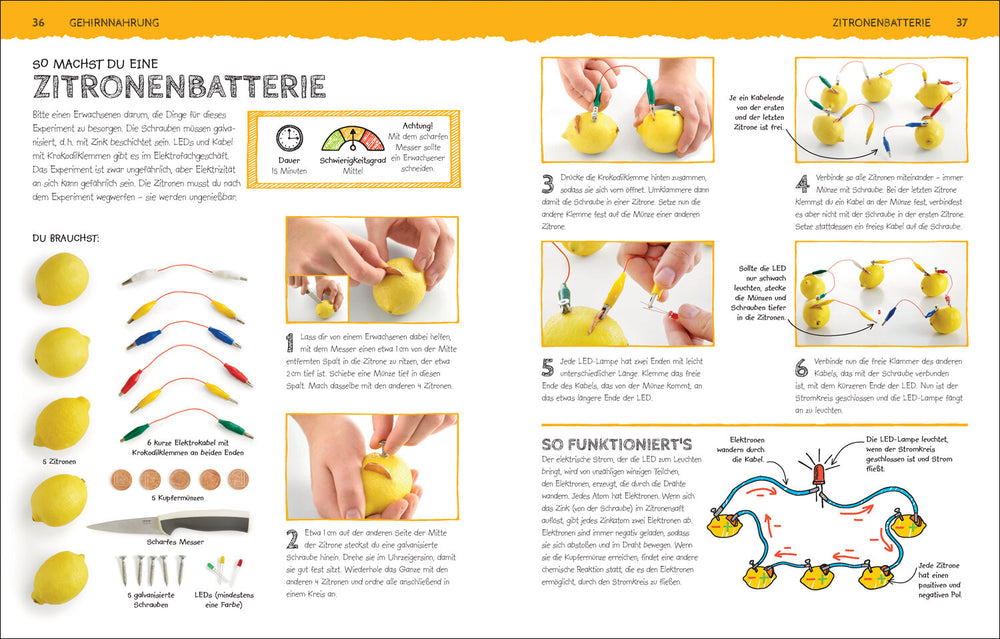 Ob eine Zitrone Strom erzeugt, ein Vulkan ausbricht oder Tinte plötzlich verschwindet – jedes Experiment überrascht, regt zum Nachdenken an und lässt kleine Entdecker staunen. Und das Beste: Alle Versuche sind sicher, altersgerecht erklärt und fördern spielerisch Neugier sowie Verständnis für naturwissenschaftliche Zusammenhänge.