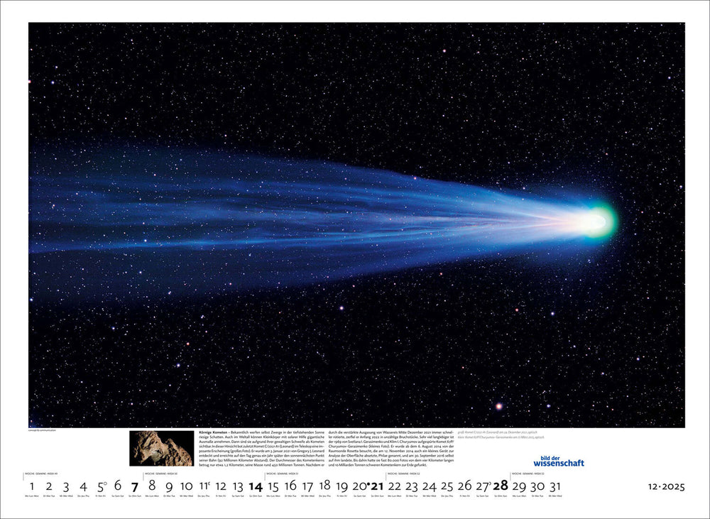 12 spektakuläre Panorama-Fotografien (70 × 50 cm) zeigen kosmische Phänomene in faszinierenden Farben: von gewaltigen Gasnebeln bis zu leuchtenden Kometenschweifen. Ein zusätzliches 13. Blatt enthält alle Monatsmotive als herausnehmbare Postkarten.